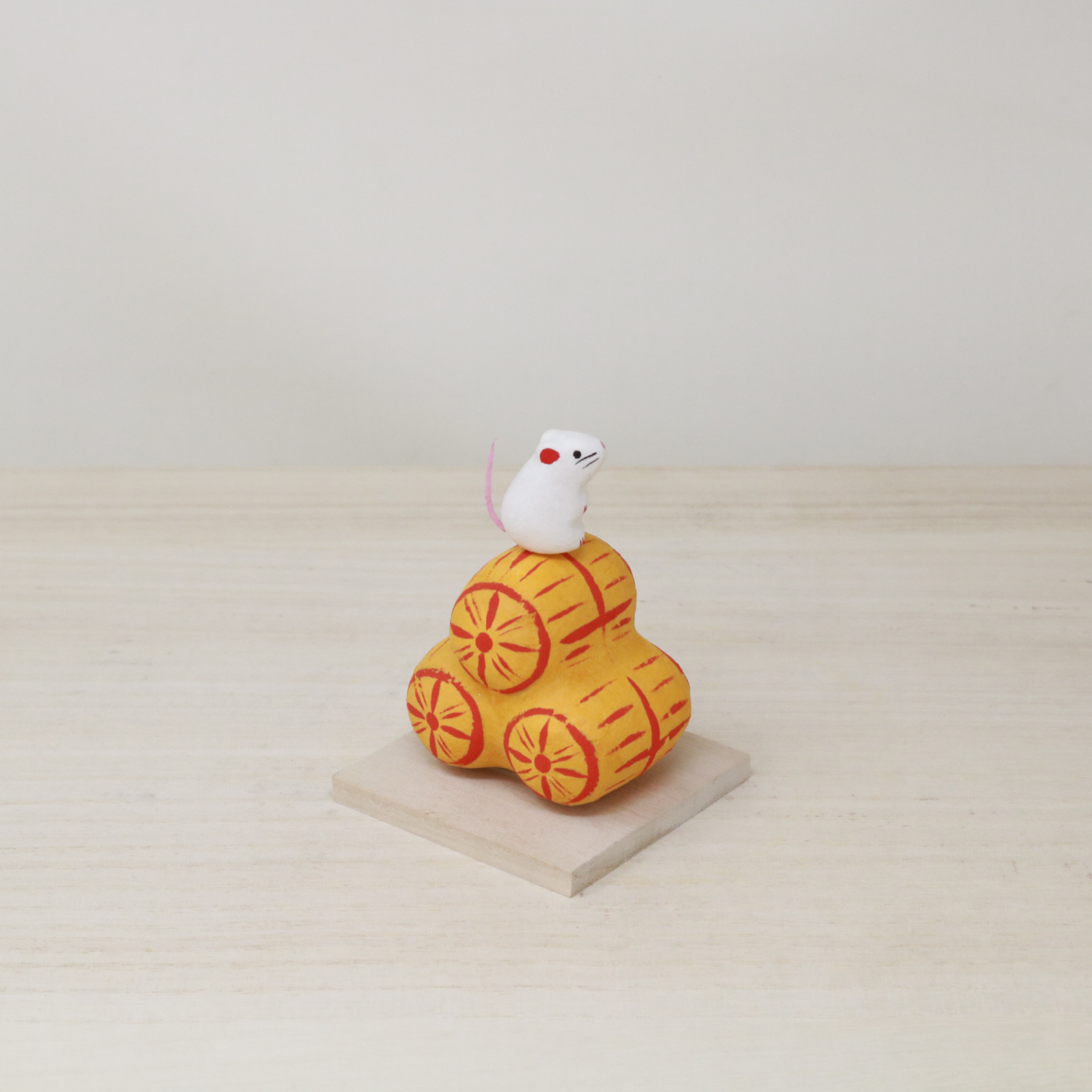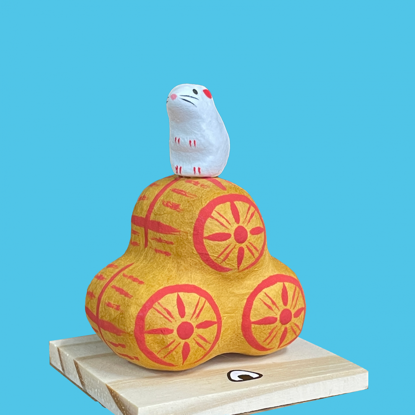 張子で作られた俵に、可愛らしい白いネズミが乗っている「俵のりねずみ」は、縁起物としての意味と愛らしいデザインが魅力的です。